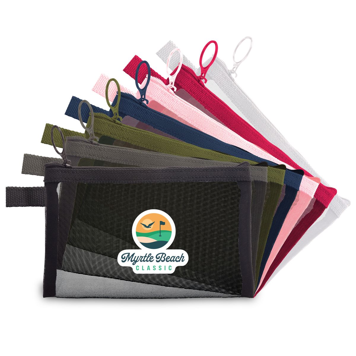 Compact-size Mesh Zipper Bag with center imprint. Lightweight, breathable, and built for adventure, our mesh bag is your go-to carry-all for everyday outdoor essentials. Perfectly sized to hold sunscreen, insect repellent, hand sanitizer, lip balm, and other personal must-haves, this bag keeps your items organized, visible, and within easy reach. The durable mesh design allows for quick drying and easy cleaning. A secure zipper closure keeps everything in place. Bags are available in Black, Gray, White, Pink, Red, Green, and Navy Blue. 5.75" W x 3.75" H x 1.25" D. Complies with Prop 65.